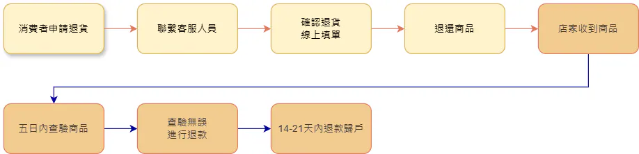 - 店家收到退回商品,檢查確認無誤後即會開始安排退款。